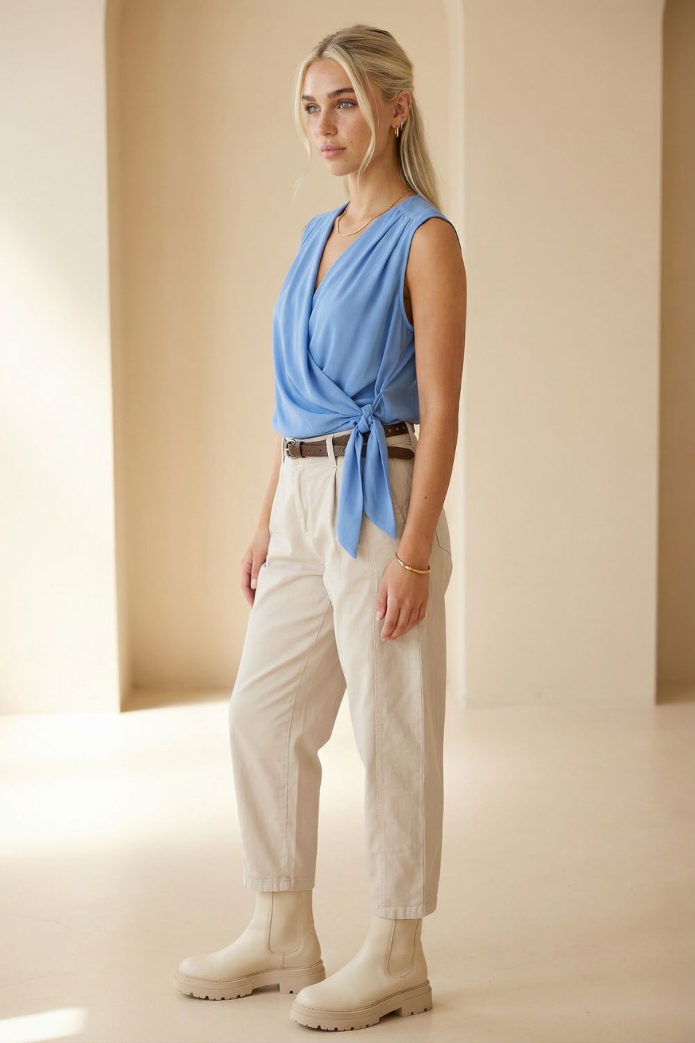 Το κρουαζέ crepe αμάνικο top σε απαλή baby blue απόχρωση είναι ένα κομψό και διαχρονικό κομμάτι που αναδεικνύει τη θηλυκή σιλουέτα. Ο κρουαζέ σχεδιασμός αγκαλιάζει το σώμα με φυσική ροή, ενώ το δέσιμο στο πλάι προσθέτει κομψή λεπτομέρεια και επιτρέπει ελαφριά προσαρμογή στην εφαρμογή.