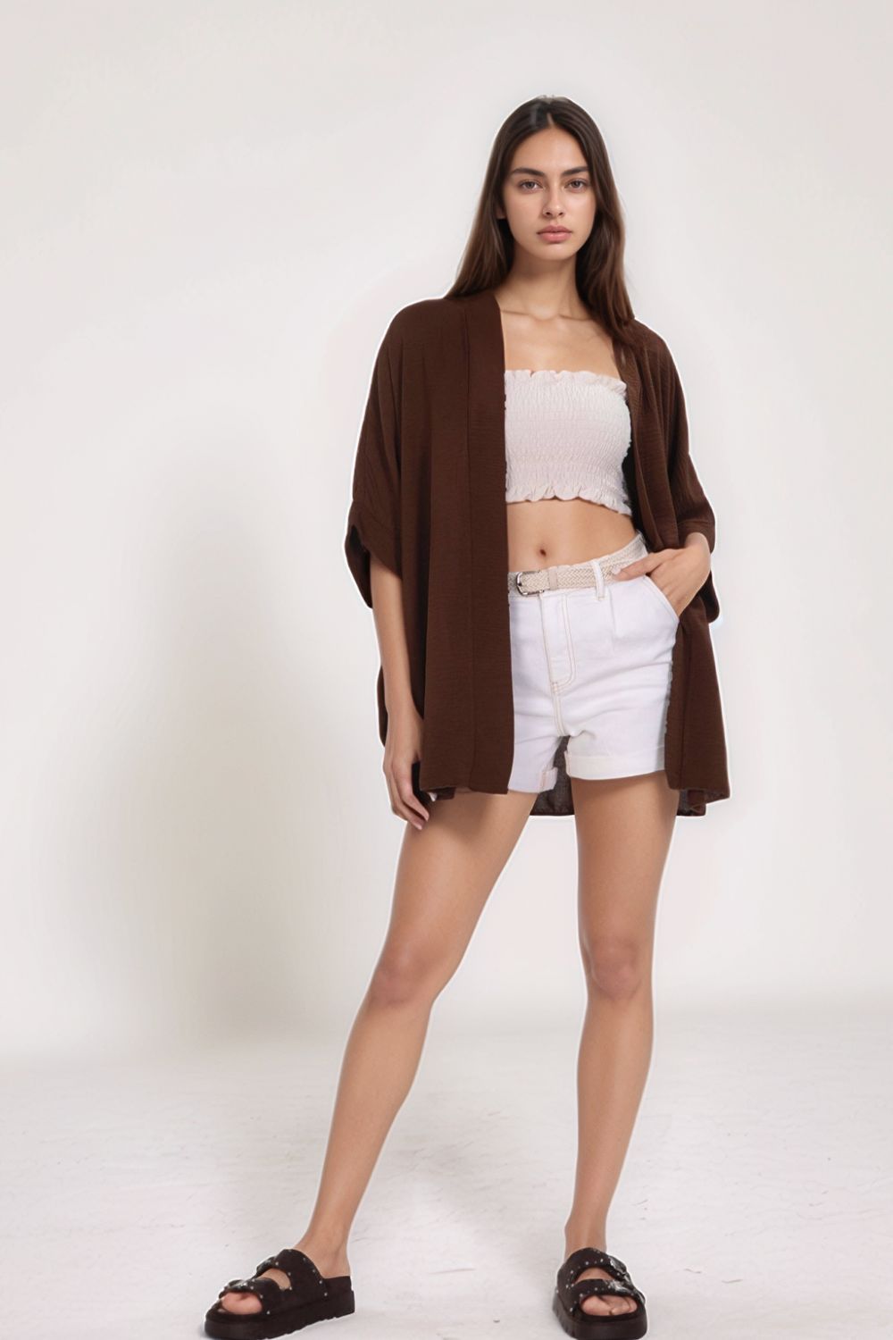 Ανανεώστε την καθημερινή σας γκαρνταρόμπα με αυτό το διαχρονικό crepe kimono, ιδανικό για layering αλλά και για να φορεθεί αυτόνομα σαν μπλούζα. Η μαλακή υφή crepe αγκαλιάζει απαλά το σώμα, ενώ η χαλαρή γραμμή και τα φαρδιά μανίκια 3/4 προσφέρουν άνεση και αέρινη κίνηση.