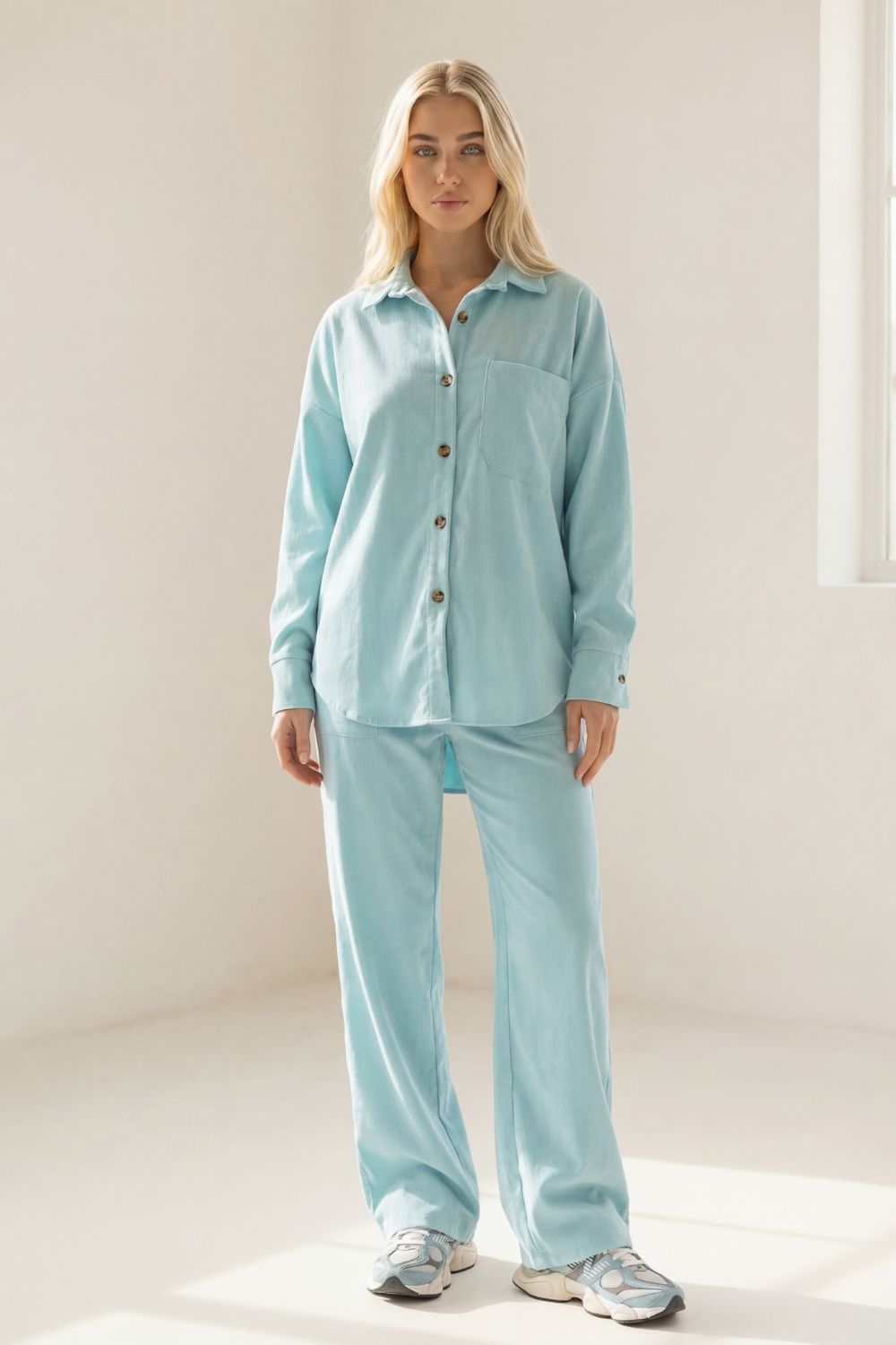 Το Oversized Σετ Κοτλέ in mint ίναι η ιδανική επιλογή για να αναδείξετε το στυλ σας με άνεση! Το σετ συνδυάζει την πρακτικότητα με την κομψότητα: η φαρδιά γραμμή της πουκαμίσας και της παντελόνας εξασφαλίζει άνετη εφαρμογή, ενώ το απαλό κοτλέ ύφασμα προσφέρει αίσθηση πολυτέλειας.