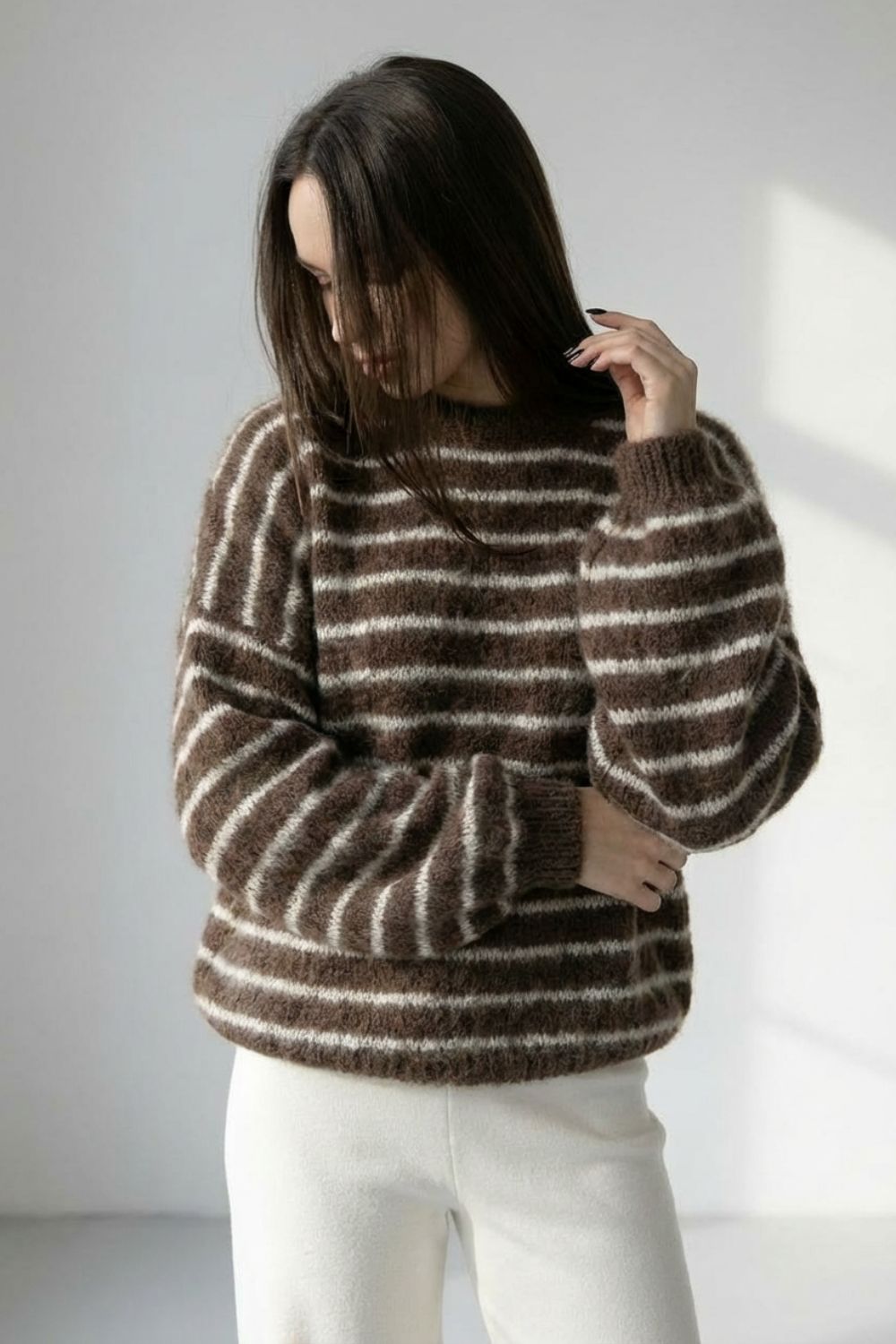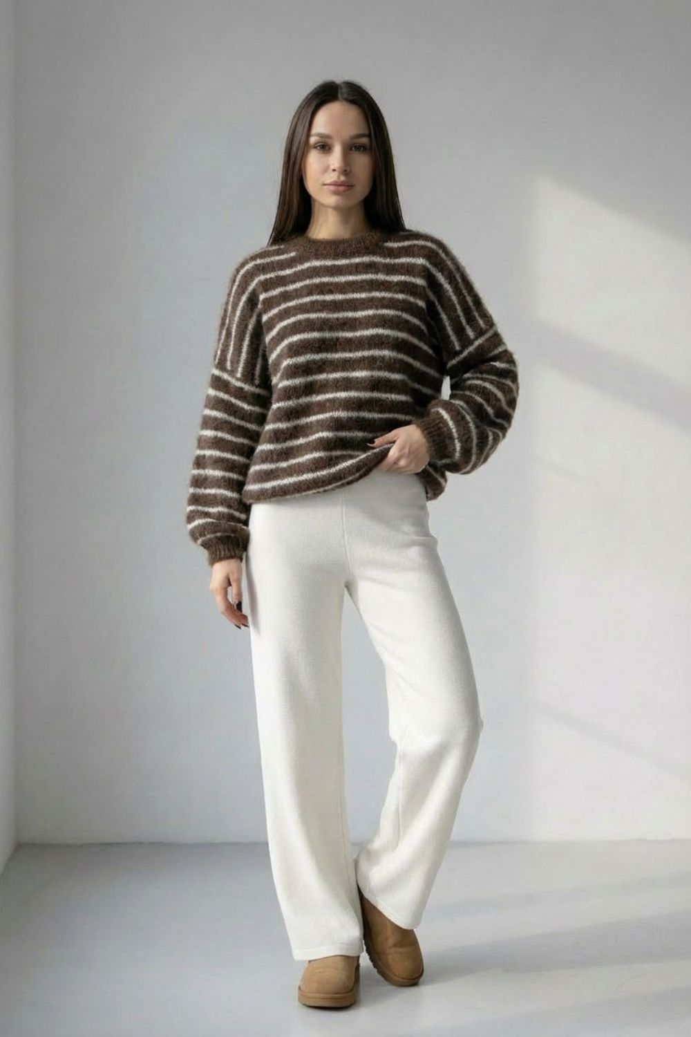 Συνδύασέ το με λευκό ψηλόμεσο παντελόνι για φωτεινή αντίθεση που αναδεικνύει το καφέ knit. Ολοκλήρωσε το look με suede ankle boots ή loafers σε φυσικούς τόνους (camel ή mocha) για cozy chic αποτέλεσμα.