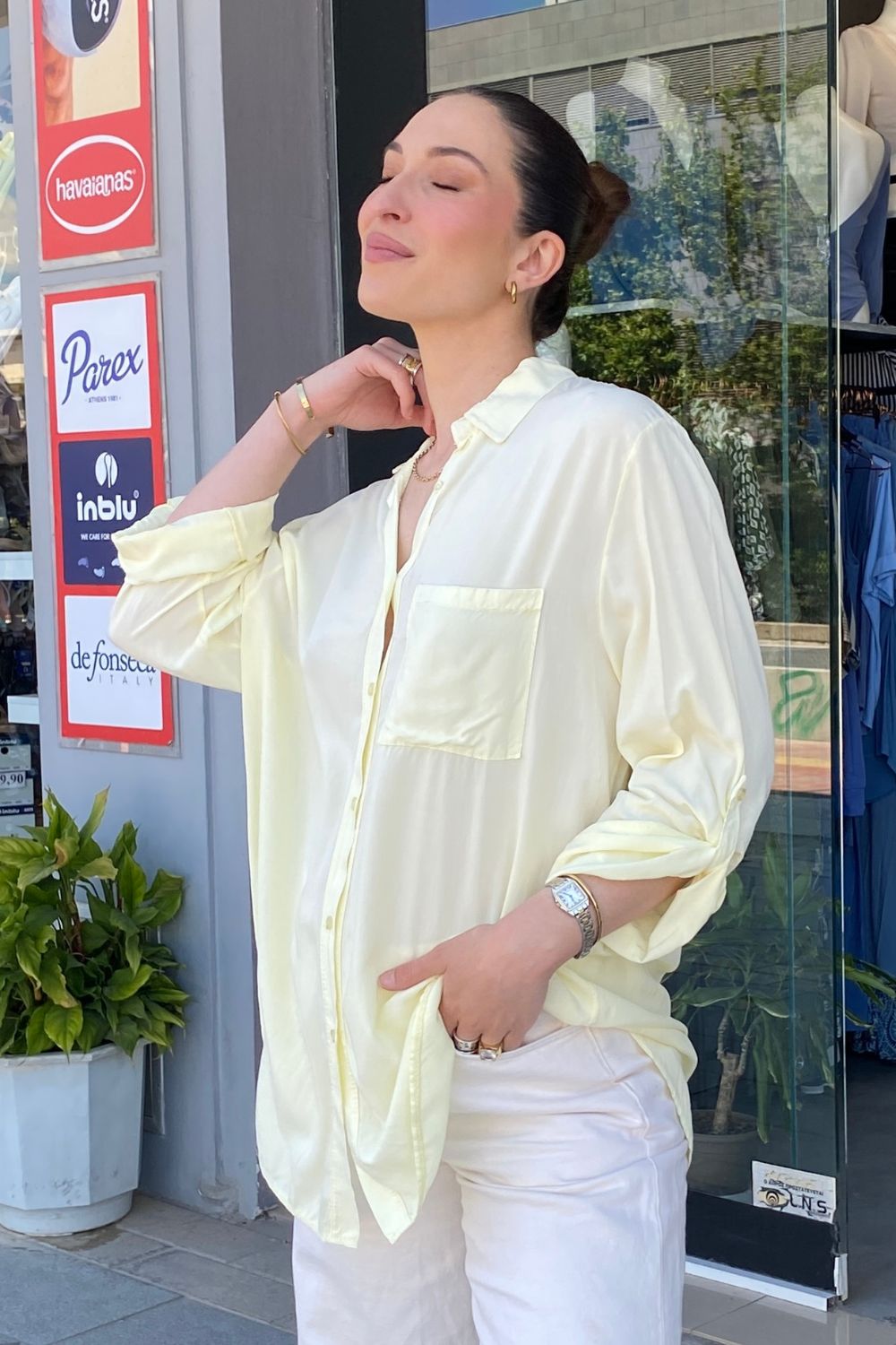 Φοριέται ως κλασικό πουκάμισο, ανοιχτό σαν ελαφρύ jacket ή δεμένο στη μέση για πιο μοντέρνο αποτέλεσμα. Το roll-up μανίκι προσθέτει πρακτικότητα και effortless χαρακτήρα.