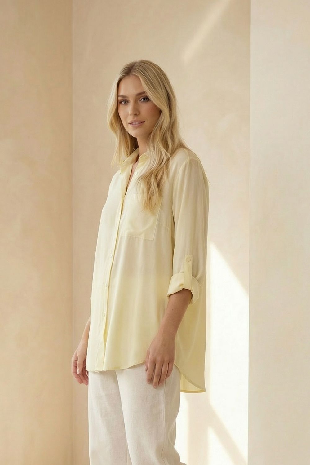 Το Viscose Oversized Πουκάμισο σε απαλή κίτρινη απόχρωση είναι το απόλυτο must-have κομμάτι για άνετα και κομψά everyday looks. Η oversized γραμμή του προσφέρει ελευθερία κινήσεων και χαλαρή εφαρμογή, ιδανική για layering αλλά και για να φορεθεί μόνο του.